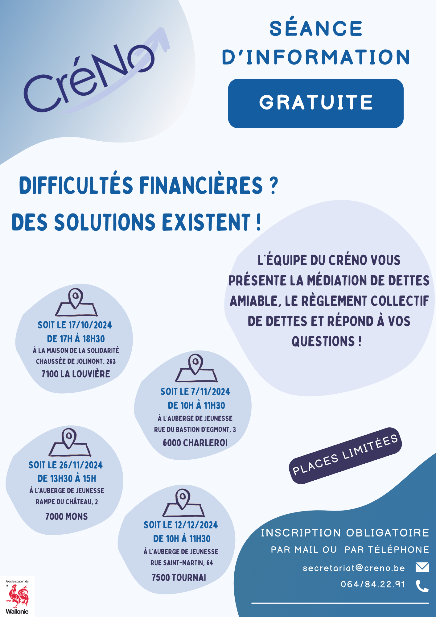 Pour ce faire, nous allons mettre en place des séances d’information collectives gratuites à destination des médiés/futurs médiés, qui correspondront à trois temps phares de la procédure en règlement collectif de dettes, à savoir : avant la requête, durant le RCD et à la clôture.