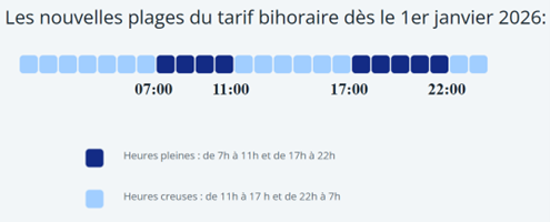 A partir du 1er janvier 2026, une nouvelle plage d’heures creuses sera disponible tous les jours de 11h à 17h. Durant cette plage, l’électricité sera au même tarif que la nuit (de 22h à 7h), et ce, 7 jours sur 7.