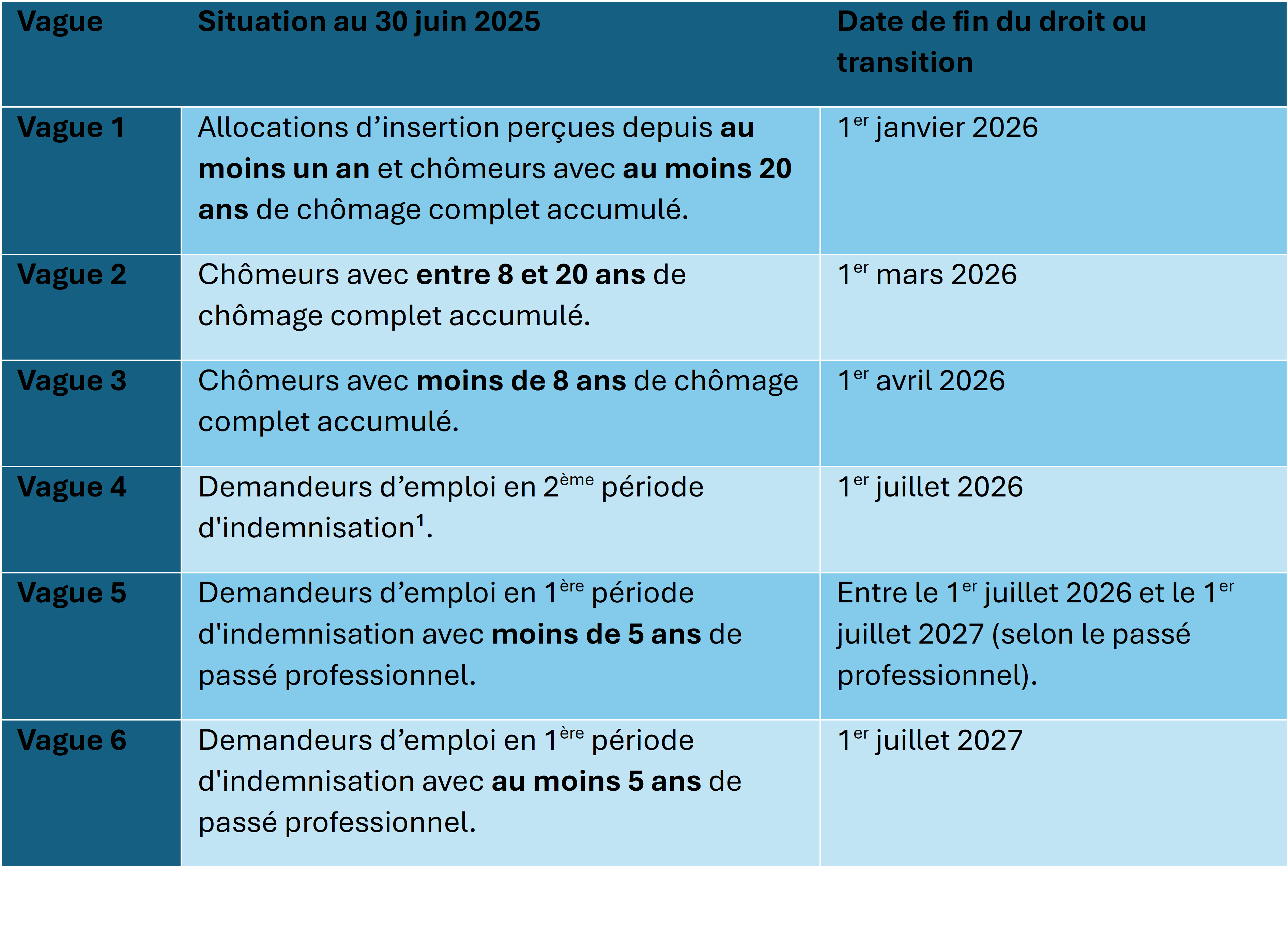 La fin du droit aux allocations ainsi que la conversion vers le nouveau régime, se font de manière progressive, en plusieurs vagues successives, déterminées par l’ancienneté du chômage du demandeur d’emploi. Ladite ancienneté est basée sur la période antérieure d’indemnisation et sur le passé de chômage complet (cumul existant entre les périodes de chômage).