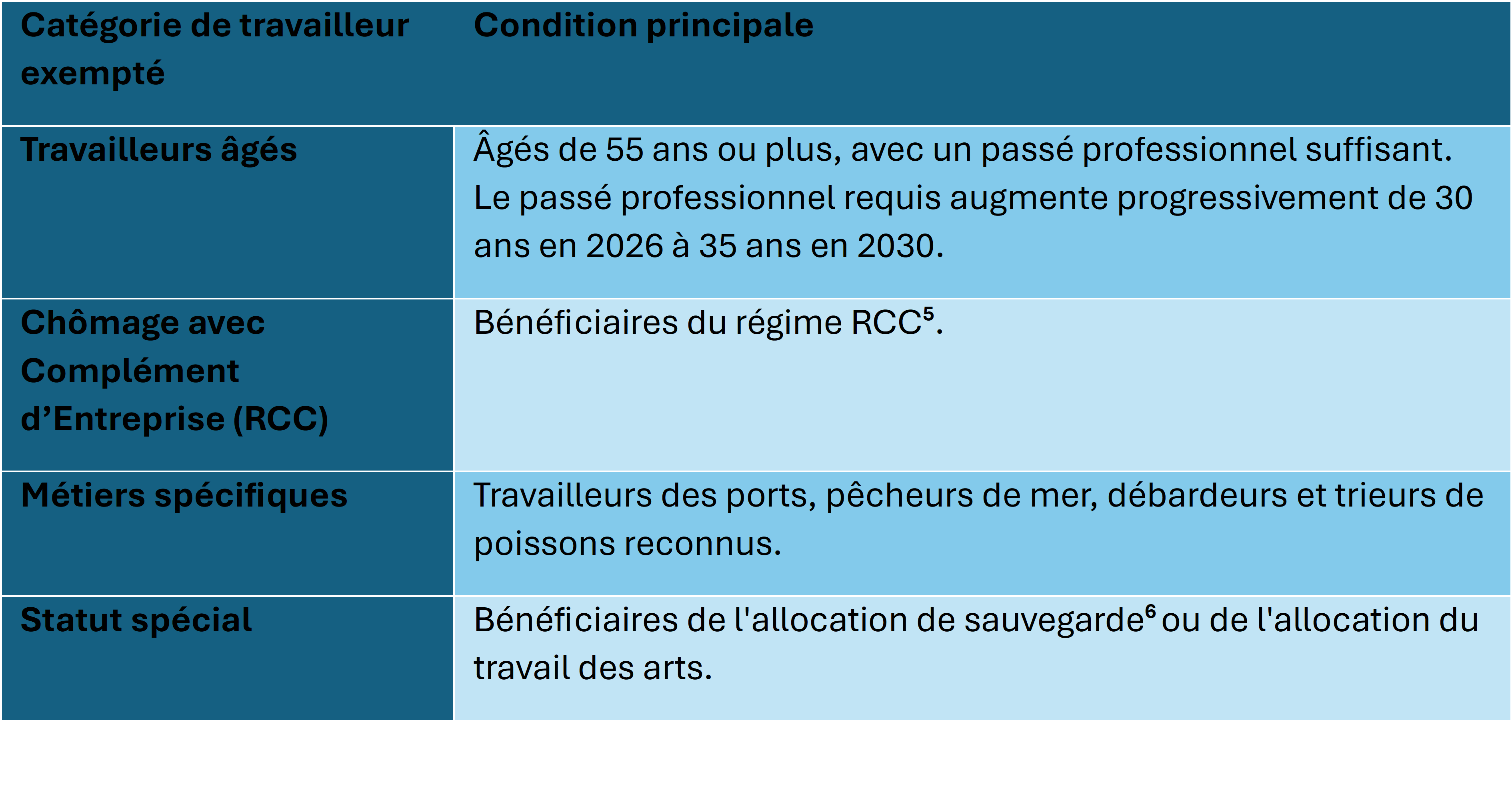 - Chômeurs âgés : Les travailleurs qui ont atteint l’âge de 55 ans au 30 juin 2025 et qui ont un passé professionnel suffisant (30 ans en 2025, montant jusqu’à 35 ans en 2030) conservent le droit aux allocations sans limitation dans le temps à partir du 1er mars 2026.