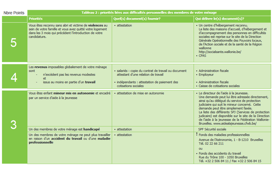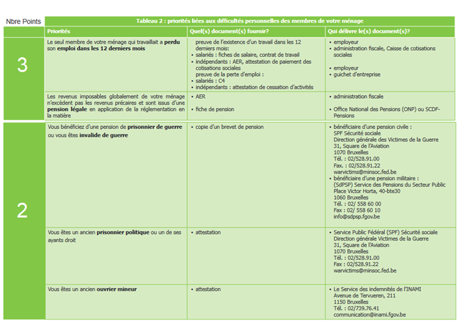 Selon la/les situation(s) de la personne, il suffit d’additionner les points pour avoir le nombre total de points de priorité (points obtenus du tableau 1 + points obtenus du tableau 2 + un point par année d’ancienneté (maximum 6 points)