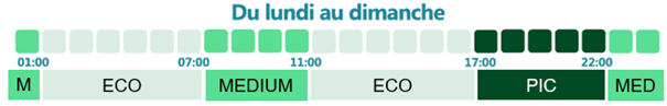 - Les heures MEDIUM : de 07H00 à 11H00 et de 22H00 à 01h00. Les frais de réseau sont trois fois plus élevés que pendant les heures ECO.