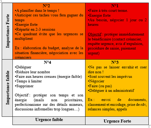 cette matrice permet de faire un tri dans les tâches à faire. Il s’agit de classifier chaque tâche à réaliser selon son importance et l’urgence de son traitement.